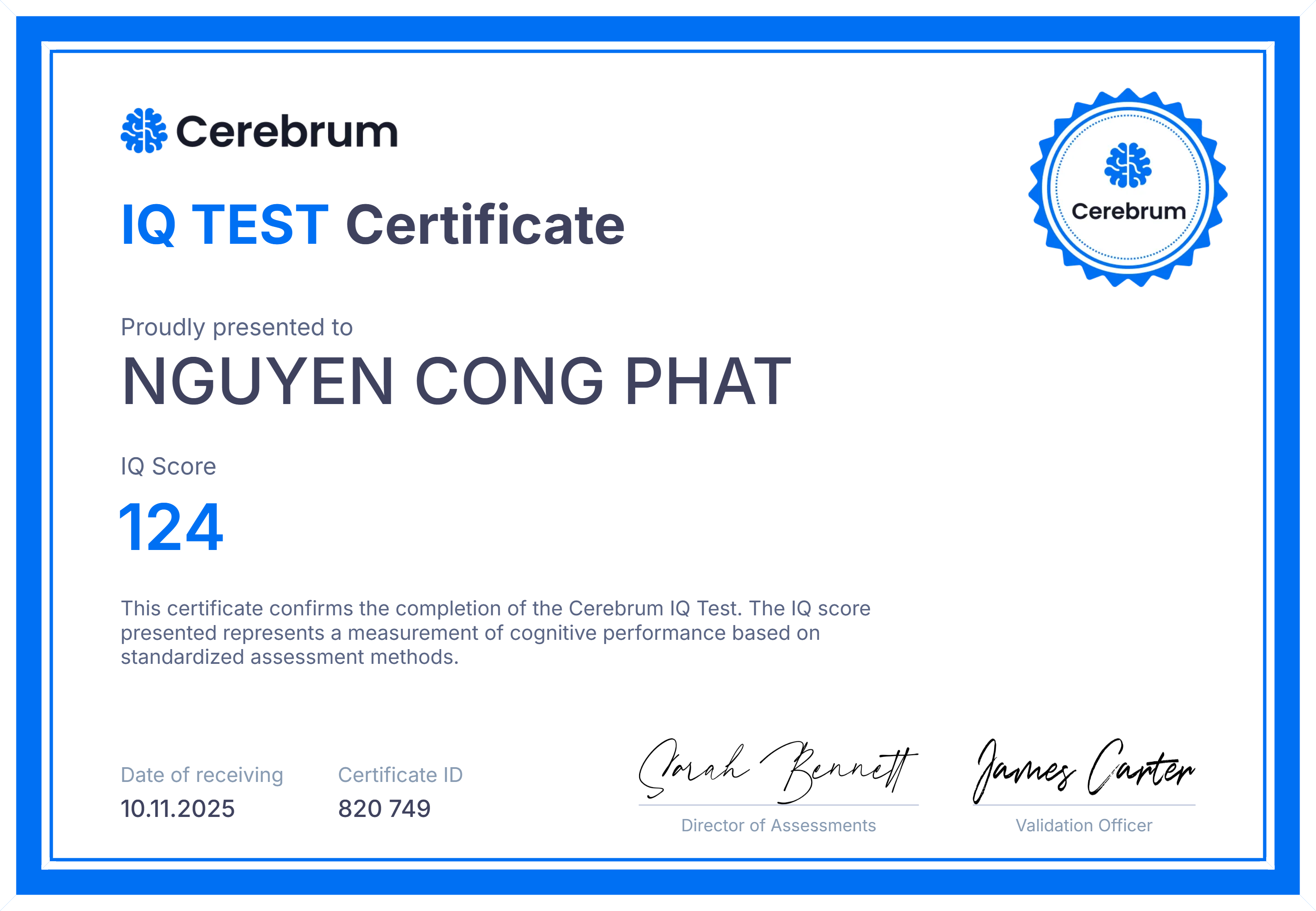 IQ Score: 124 — measured by Cerebrum IQ Test (Nov 2025).